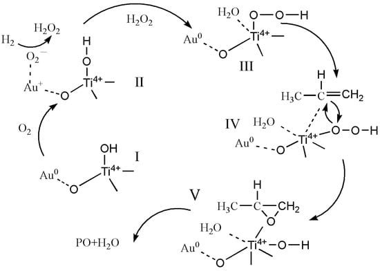 Table 2 shows that compared with H2 pretreatment, the catalysts with O2 pretreatment exhibit more surface-active oxygen species OII and that without washing, which kept more K and chloride, strengthens the results. Therefore, 0.5%Au/TS-1-O2 catalyst provides the highest content of surface-active oxygen species. The resulting adsorption of O2 on the catalyst was also evidenced by XPS observation and DFT calculation in other references [,,]. According to the well-known mechanism of direct epoxidation of propylene, it is generally believed that oxygen obtains electrons from reduced Au species, which then becomes surface-active oxygen (O2−) and forms -OOH [,], which is the rate-limiting step in the formation of PO (as shown in Figure 7).