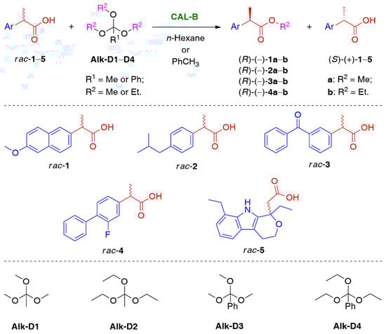 Lipase-catalyzed enantioselective resolution of racemic NSAIDs rac-1–5 in organic solvents using trialkyl orthoesters Alk-D1–D4 as irreversible alkoxy group donors.
