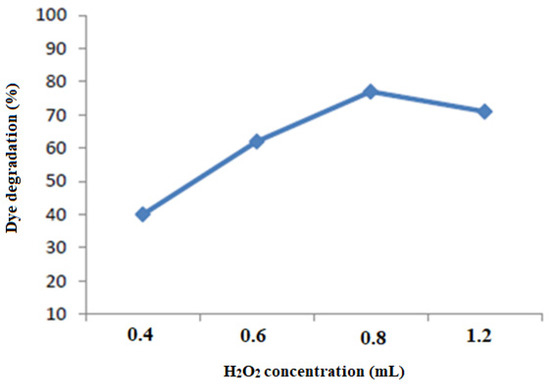 The addition of H2O2 is important to improve the efficiency of AOPs. Different concentrations of H2O2 (0.4–1.2 mL) were added to dye solutions and irradiated with UV light. It was observed that UV/H2O2 enhanced the photodegradation process manyfold versus UV treatment alone. The RY-160A degradation was enhanced by increasing H2O2 up to a certain limit and, then, declined (Figure 4). At a concentration of 0.4 mL, degradation was 40.8% and when H2O2 concentration was increased to 0.6 mL, the degradation was 62.13%, which was 77.78% at 0.8 mL of H2O2, which is an optimum concentration because beyond this concentration the degradation rate was declined. This is attributed to the scavenging effect of hydrogen peroxide [23], at higher hydrogen peroxide concentration, the •OH radical and H2O2 reacts to produce HO2• radical; hence, the low generation of the •OH radical, the RY-160A degradation was declined. The •OH radical scavenging process is shown below [24].
