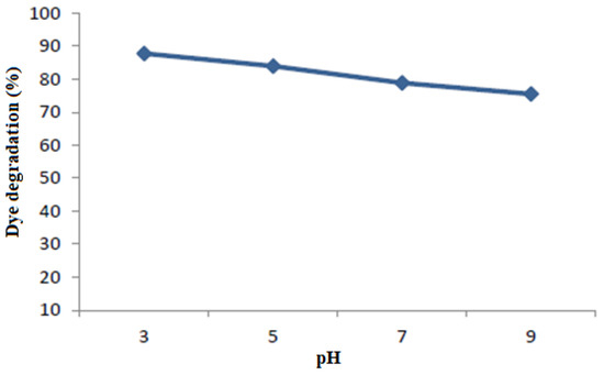 The dyestuff discharge from different industries has a variable pH, which needs to be optimized for an effective degradation process. The pH effect on the degradation of RY-1620A was studied in the 3–9 pH range (Figure 7). At pH 3, the degradation of Ry-160A dye was 87.8%; by increasing the pH, the dye degradation was also affected; and at pH 5, 7, and 9, the dye degradation was absorbed to be 84, 78.9, and 75.5%, respectively. The degradation was higher at low pH values, which is attributed to the fact that hydroxyl radicals are produced effectively in this pH range and at basic pH; the hydroperoxyl radicals that are formed have low oxidation potential; hence, the dye degradation was reduced. The catalyst surface also carries a negative charge in a basic environment, which causes repulsion to anionic species and hydroxyl radicals. Hence, the degradation rate for anionic dye was higher in acidic medium and low basic medium [28].