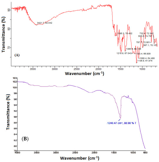 (A) FTIR spectrum of Reactive yellow 160A before UV treatment and (B) FTIR spectrum of Reactive yellow 160A after treatment (TiO2 = 450 mg/L, pH = 3, RY-160 = 30 mg/L, irradiation time = 120 min).