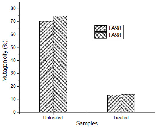 The hemolytic test is a promising test for cytotoxic effect evaluation. The erythrocyte membrane mechanical stability illustrates how cytotoxicity is affected by different agents [29]. The hemolytic analysis of untreated RY-160A (30 mg/L, 0.8 mL H2O2, 450 mg/L TiO2) revealed the cytotoxic nature, where before the treatment, up to 13% RBCs lysis was observed, which reduced to 7.3% after treatment (Figure 11). Similarly, the RY-160A solution revealed mutagenicity of 70.4% (TA98) and 74.5% (TA100) before treatment. The treated dye sample (30 mg/L, 0.8 mL H2O2, 450mg/L TiO2) showed a less mutagenic effect, which was reduced to 80.8% (TA98) and 81.4% (TA100) after treatment (Figure 12). The results clearly demonstrate that the photocatalytic treatment reduced the mutagenicity of RY-160A dye significantly after treatment. Currently, a variety of dyes are used in the textile industry and a huge quantity of dyes are discharged into water bodies, which are toxic to the living organisms [30,31,32,33,34,35,36]. To avoid the negative impact of dyes, there is a need to treat the wastewater before being discharged into the watersheds and photocatalytic treatment is one of the most promising approaches in this regard versus other conventional techniques [37,38,39,40,41,42].