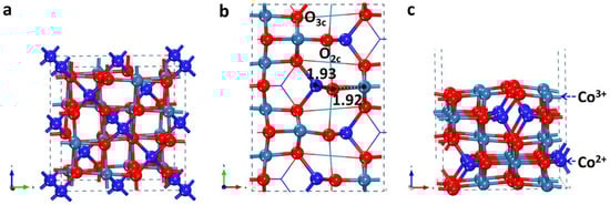 According to the experimental studies of the HCHO oxidation over Co3O4-based catalysts, a complete catalytic oxidation process is usually accompanied by the formation of intermediates such as CH2O2, HCOOH, and HCOO [17,19,27]. These intermediates are gradually oxidized by ROS (including O, OH,) and finally generate CO2 and H2O [20,28,29]. Therefore, there indeed exists different kinds of possible species in the reaction of HCHO oxidation to CO2 and H2O. In order to explore the reaction mechanism in detail, the (110)-B termination was chosen to model the Co3O4 surface (the reasons for choosing (110)-B termination are detailed in Section 3.1). The p() supercell slabs were utilized for the Co3O4 (110)-B surface, which are visualized in Figure 1.