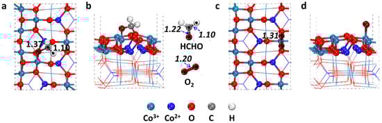 The most stable adsorption configurations together with electron density difference of HCHO (a,b) and O2 (c,d) on the Co3O4 (110) surface. The unit of bond lengths are Å.