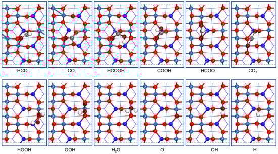 The location of all possible intermediates on the Co3O4 (110) surface should be confirmed. The most stable adsorption configurations of HCHO and O2 have been given in Figure 2. In addition, Figure 3 presents the adsorption configurations of possible intermediates. The corresponding adsorption energies and key structural parameters are listed in Table 1.