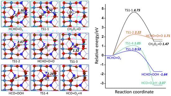 According to Table 2, all reactions on Co3O4 (110) surface are represented by Rn-m (n = 1~5; m = 1~10). The reactions from R1-1 to R1-4 represent four possible initial steps when HCHO and O2 co-adsorb on Co3O4 (110) surface. Figure 4 presents the potential energy profiles of possible pathways of the four possible initial steps together with transition states (TSs) and final states (FSs) on the Co3O4 (110) surface.