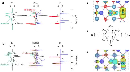 Electronic structure analysis. (a) Projected electronic density of states (PDOS) and schematic illustrations of 3D orbitals of Co on Co3O4 (110) surface, 2p-orbitals of the O2 gas molecule, and their interaction within Co3O4-O2 configuration. (b) PDOS and schematic illustrations for Co3O4-OOH interaction configuration. As the O2 and OOH adsorb on a Co top site, the PDOS displays this Co atom and O2/OOH.(c,e) The charge density difference of O2 and OOH adsorb on Co3O4 (110) surface, respectively. (d) O2 molecular orbitals.