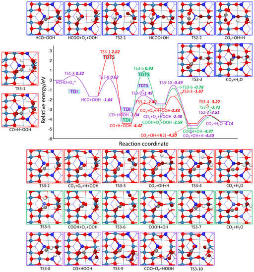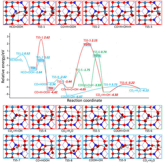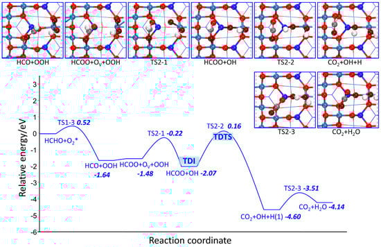 In Figure 8 and Figure 9, the TDTS and TDI marked in different colors represent different paths of TDTS and TDI. As the TDTS comes after the TDI for the five routes, according to formula (5a), the δE for these five routes are 4.26 eV, 2.29 eV, 6.57 eV, 5.16 eV, and 1.65 eV, respectively, which means that the efficiency of catalytic cycles of the light blue line marked path is satisfactory. Therefore, the optimal reaction path of the HCHO oxidation process is as follows: two H atoms of HCHO are successively transferred directly to O2 to form HOOH. Subsequently, the O–O bond of HOOH is broken to generate two OH. One OH binds to CO to form COOH, whose H atom further combines with another OH to finally generate CO2 and H2O.