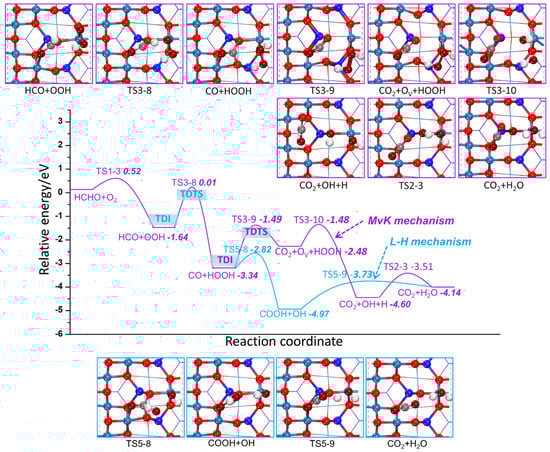 Starting from HCHO and O2 co-adsorption, the most favorable reaction paths that belong to MvK and L-H mechanism are shown in Figure 10 and Scheme 1. Two H atoms of HCHO transfer to O2 continuously for CO and HOOH formation are the first two favorable steps. For MvK mechanism, CO grabs Olatt to generate CO2 firstly. The maximum activation barrier is 1.85 eV in this reaction path. The subsequent steps are the O–O bond of HOOH breaking and O vacancy filling by O atom of OH. Finally, H atom move to another OH for H2O formation. For L-H mechanism, COOH is formed through CO drawing OH from HOOH, and then H atom of COOH is taken away by another OH for CO2 and H2O formation. The maximum activation barrier of this reaction path is 1.65 eV, corresponding to the second H atom of HCHO dehydrogenation, which is slightly lower than that of MvK mechanism. Therefore, the highest energy barriers to overcome for the MvK and L-H mechanisms are similar, making both mechanisms feasible. The δE of the two paths correspond exactly to the activation barrier, suggesting that the catalytic cycle through the two mechanisms are equivalent to some extent. It is worth noting that due to the relatively strong exotherm of the reaction, HCHO cannot be oxidized smoothly at room temperature if the energy released in the previous cycles cannot be fully utilized for subsequent cycles. In addition, the maximum δE cannot be affected by the reaction energy according to formula (5b), resulting in TDTS appearing after TDI in all possible paths through MvK and L-H mechanism.