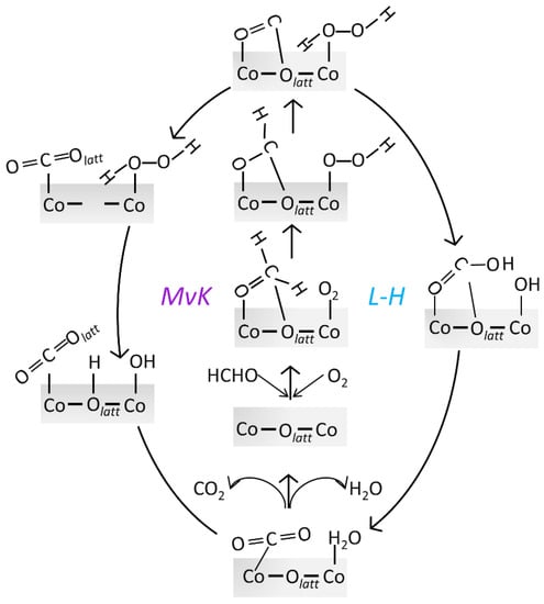The catalytic path of HCHO oxidation can follow three mechanisms, including the Langmuir–Hinshelwood (L-H) mechanism, Eley–Rideal (E-R) mechanism, and Mars-van Krevelen (MvK) mechanism. Numerous experimental studies proved that the reaction path of HCHO oxidation on Co3O4-based catalysts mainly follows the L-H mechanism [19,20,21,22]. These studies utilized oxygen vacancy (OV) engineering or load noble metals to enhance the catalytic activity of Co3O4-based catalysts at room temperature. Surface-adsorbed ROS obtained by dissociating O2 from oxygen vacancies or noble metal sites are generally considered to be the most important ROS. For the L-H mechanism, the reaction starts from HCHO and O2 co-adsorption on surface to form carbonaceous intermediates and ROS, and then the adsorbed carbonaceous intermediates are oxidized by ROS into CO2 and H2O. Different from the L-H mechanism, the details of the E-R mechanism are that pre-adsorbed O2 first forms ROS, which then makes contact with HCHO and further oxidizes it into CO2 and H2O. However, the MvK mechanism that the catalytic oxidation of HCHO may follow is usually less frequently mentioned [11]. For the MvK mechanism, lattice oxygen (Olatt) oxidizes HCHO into CO2, accompanied by the formation of an oxygen vacancy. Then, adsorbed O2 dissociates on the oxygen vacancy into two active O atoms, one fills the O vacancy and the other combines with H atoms derived from HCHO for H2O generation. Thus, the biggest difference between the MvK mechanism and the L-H mechanism is whether surface adsorbed ROS or Olatt participates in HCHO oxidation, yet the possibility that these two routes are jointly involved in the catalytic oxidation of HCHO cannot be ignored.