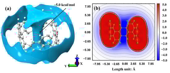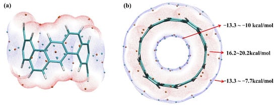 Since [6, 6] CNB has high symmetry, the dipole moment is zero, but we cannot simply consider [6, 6] CNB as a non-polar molecule. This is because the local polarity cannot be ignored. The electrostatic potential is directly determined by the charge distribution of the system, so the electrostatic potential can characterize the polarity of the system, which is of great significance for investigating the electrostatic interactions between molecules. We chose the van der Waals surface with an electron density of 0.001 a.u. for research, because this surface can describe the electrostatic interactions between molecules very well. As shown in Figure 2, the internal and external electrostatic potential distributions of [6, 6] CNB were −13.3~−10.0 kcal/mol and −13.3~−7.7 kcal/mol (the lowest internal and external electrostatic potentials are equal), while the electrostatic potential near the hydrogen atom was 16.0~21.0 kcal /mol. We speculate that the electrostatic interaction had little effect on the interaction between the internal and external parts of the [6, 6] CNB. The molecular polarity index (MPI) is a quantity that can reflect polarity through the distribution of electrostatic potential [37]. MPI is defined as