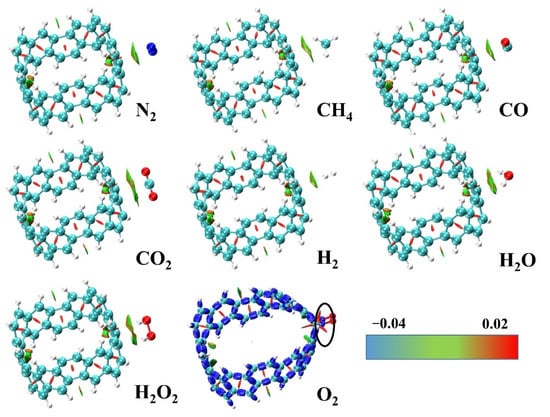 The optimized structure and RDG diagram (isovalue = 0.5) of small molecules adsorbed on the outside of [6, 6] CNB. Only [6, 6] CNB&O2(ext) use the Interaction Region Indicator (IRI) method. The surfaces between the [6, 6] CNB and the adsorbates correspond to the isosurface of RDG mapped by function, in a.u.