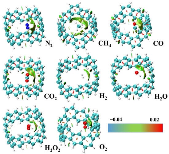 The optimized structure and RDG diagram (isovalue = 0.5) of small molecules adsorbed on the inside of [6, 6] CNB. The surfaces between the [6, 6] CNB and the adsorbates correspond to the isosurface of RDG mapped by function, in a.u.