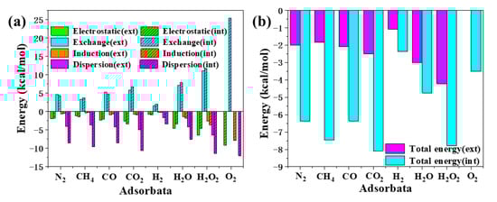 The SAPT energy decomposition result is shown in Figure 6a. The abscissa was different small molecules, and the ordinate was the energy of different physical components of the interaction. Components with positive energy played a repulsive role in the adsorption process, while components with negative energy played an attractive role. It can be seen that the repulsive force in the adsorption of small molecules in all systems studied was dominated by exchange interaction. The intermolecular attraction was provided by electrostatic, dispersion and induction interaction. Among them, the induction interaction was relatively small, and the dispersion interaction was stronger than the electrostatic in most systems. This also confirms the conclusion drawn in the previous RGD analysis that the dispersion interaction is dominant in the adsorption process. Next, we will analyze the energy absorbed by [6, 6] CNB and small molecules in detail.