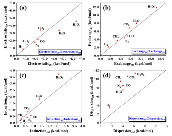The position of small molecules in the adsorption process has such a great influence on the total energy of the interaction. In order to understand which composition the difference comes from, we processed the data of the different physical components of all systems. We drew a scatter diagram of the four physical components with the energy absorbed inside as the ordinate and the energy absorbed outside as the abscissa and show the y = x curve. These graphs proficiently express the degree of changes in the energy of small molecules adsorbed inside and outside the [6, 6] CNB. It can be clearly seen from Figure 7 that the points of electrostatic (Figure 3a), exchange (Figure 3b) and induction (Figure 3c) are evenly distributed on both sides of the y = x curve, while the points of dispersion (Figure 3d) are all above the y = x curve. This shows that the different adsorption positions of small molecules had less influence on the electrostatic, exchange and induction interactions in the intermolecular interaction, but had a greater influence on the dispersion interaction. It is not difficult to see that the dispersion interaction of [6, 6] CNB&X(int) was significantly stronger than [6, 6] CNB&X(ext), which was also the main source of the huge difference in total energy.