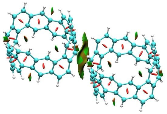 The optimized [6, 6] CNB dimer exhibited a staggered and juxtaposed structure, and the vertical distance between molecules was 3.10 Å. Since the stacking interactions between dimers were weak interactions, the intermolecular interactions had no obvious effect on the electronic structure of monomers. Next, we decomposed the interaction energies of [6, 6] CNB dimers again using RDG and SAPT energy decomposition methods to investigate the nature of intermolecular interactions. As shown in Figure 8, the isosurface of the intermolecular interaction of the dimer was green and accompanied by red, which indicates that the intermolecular interaction was dominated by the dispersion interaction, accompanied by a certain steric effect. The energy decomposition results are shown in Table 2. The dispersive interaction was the main source of the attraction between dimers, accounting for 70%, followed by the electrostatic interaction (23%), and the smallest contribution to the mutual attraction was the induction interaction at only 7%. Quantum theory of atoms in molecules (QTAIM) is another very popular method for analyzing weak interactions. QTAIM is a method to quantitatively study weak intermolecular interactions by analyzing intermolecular bond critical points (BCPs). The QTAIM theory also defines the intermolecular interaction pathways (yellow lines in Figure 9). Since we only focused on intermolecular interactions, we only provided four BCPs between molecules. The BCP 1 and BCP 4 were equivalent, and the BCP 2 and BCP 3 were equivalent. We calculated the electron density (), the potential energy density (V), the laplacian of the electron density (), the energy density (H) and the electron localization function (ELF) at the BCPs. The electron density and potential energy density at the BCPs were closely related to the strength of the interaction between atoms. The potential energy density reflected the external potential felt by the electron and was negative. It is generally believed that the greater the electron density and the more negative the potential energy density, the stronger the chemical bond strength between atoms. So, the bond strength of BCP 2 was significantly stronger than that of BCP 1. The is usually used to determine the type of chemical bonds. A positive value of indicates that a non-covalent bond is formed between atoms, and a negative value of indicates that a covalent bond is formed. It was obvious that the at the BCPs were all negative, which indicates that non-covalent bonds were formed between atoms. Energy density reflects the energy of electrons, and the positive and negative energy density can also be used to determine the type of chemical bond. A positive H is believed to form a non-covalent bond, and a negative H represents the formation of a covalent bond. The analysis results are the same as the conclusions drawn by . The ELF reflects the degree of electron localization at the BCPs. It can be seen that the localization degree of BCP 2 was significantly stronger than that of BCP 1.