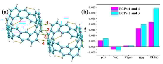 In a high-concentration environment, the main form of [6, 6] CNB is likely to be a dimer system. Therefore, it was very important to study the interaction between [6, 6] CNB dimers. In this section, we present the results for the intermolecular interactions of [6, 6] CNB dimers and real-space functions such as electron density at bond critical points.