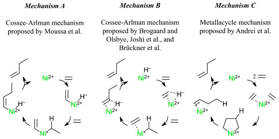 The mechanism of ethylene oligomerization with nickel-based solid catalysts has been the focus of recent publications [5,28,29,30,31,32]. Joshi et al. summarized these recent findings in a review published in 2020 [33]. These reports agree that the mechanism of ethylene oligomerization with heterogeneous catalysts is similar to those observed in homogeneous catalytic systems. The most accepted mechanisms for ethylene oligomerization with nickel-based heterogeneous catalysts are shown in Figure 1.