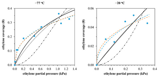 Figure 2 shows experimental ethylene adsorption isotherms on the Ni-H-Beta catalyst with 4.1 wt. % nickel at −77 and −20 °C and the fitting of the experimental data using the Freundlich isotherm (Equation (3) and the Langmuir isotherms presented in Table 1. Values for the adjusted constants can be found in the Supporting Information (Table S1). A preliminary observation of the fitted isotherms at −77 and −20 °C showed that the Freundlich isotherm and the Langmuir isotherm that assumed the dissociation of ethylene over two sites fit the experimental data with more accuracy than the other isotherms; notably, these two isotherms produced virtually the same results. The fact that the experimental data obeyed both the Freundlich and Langmuir isotherms suggests that the heat of adsorption remained constant with ethylene coverage over the range of ethylene coverages shown in Figure 2. As a result, the catalyst was uniform under the conditions used in the adsorption study, and the extent of the site heterogeneity was small. Also, it can be assumed that intersite or adsorbate–adsorbate interactions were negligible at the surface—in other words, the adsorption sites were isolated (Ni2+ and H+).