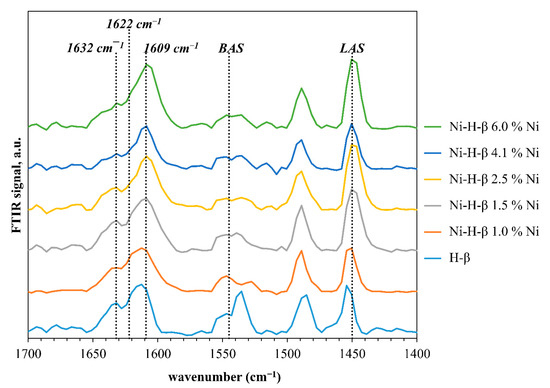 Figure 3 shows infrared spectra in the pyridine region after pyridine adsorption over Ni-H-Beta catalysts with different nickel loadings. Peaks at 1450 and 1545 cm−1 have been assigned to pyridine coordinated with Lewis (Figure 3—LAS) and Brønsted (Figure 3—BAS) acid sites, respectively [4,5,11,62].