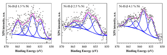 Ni 2p3/2 X-ray photoelectron spectra of Ni-H-Beta catalysts with nickel loadings of 1.5, 2.5, and 4.1 wt. %. Gray points: measured XPS; blue lines: fitting of individual peaks; purple line: sum of the fitted peaks.