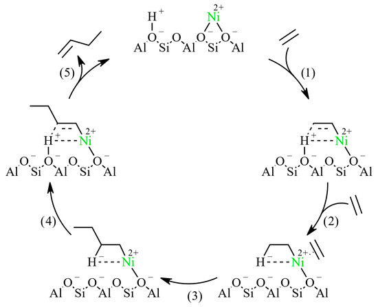 Proposed mechanism for formation of a nickel-hydride site involving a Brønsted acid: (1) ethylene adsorption over a Ni2+ site and an adjacent Brønsted site, (2) formation of [Ni(II)-H]+ center followed by coordination of another ethylene molecule, (3) insertion to form adsorbed butyl, (4) recovery of the Brønsted site, and (5) desorption to form a product followed by recovery of the Ni2+ site.