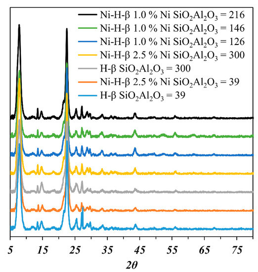 Figure 6 shows the X-ray diffraction (XRD) patterns of the pristine H-Beta supports with SiO2/Al2O3 ratios of 39 and 300 and Ni-H-Beta catalysts with SiO2/Al2O3 ratios of 39, 126, 146, 216, and 300 with nickel loadings of 1.0 and 2.5 wt. %. A comparison of the XRD patterns of the Ni-H-Beta catalysts and the H-Beta supports used in their preparation indicated no apparent changes in the intensity and position of the diffractions. This analysis showed that the acid treatment and nickel impregnation did not cause significant changes to the crystallographic structure of the catalysts, which is consistent with the previous literature [68].