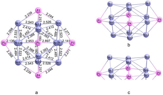 Ni12P5 cluster model, pink and purple balls represent P and Ni atoms, respectively. (a) Top view; (b) side view; and (c) for brevity, the atoms out of the reaction site are not shown.