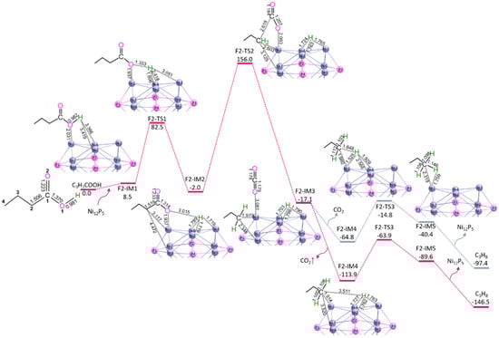 The potential energy curves and geometric structures for Reaction 1 of C3H7COOH → C3H8 + CO2 over Ni12P5 cluster are shown in Figure 2, the detailed energy data are shown in Table S1.