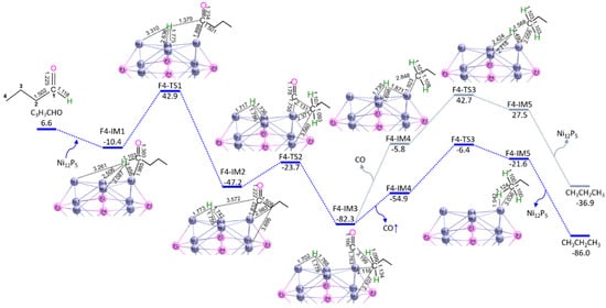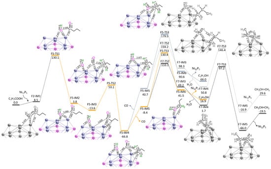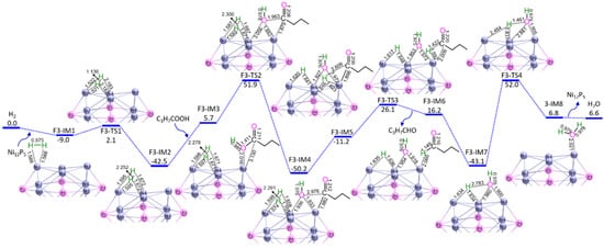 Here, S5 (Equation (6)) and S6 (Equation (7)) are related to the direct decarbonylation of butyric acid to propanol, and the hydrodehydration of propanol to propane, respectively. The potential energy curves and geometric structures for reaction stages of S5 and S6 over Ni12P5 cluster are shown in Figure 5 and Figure 6, respectively. The detailed energy data are shown in Tables S4 and S5.