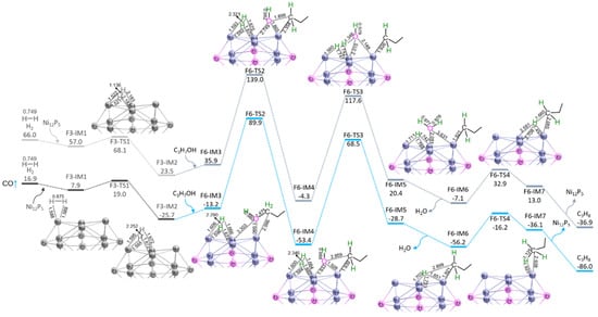 Additionally, as shown in Figure 6, S6 mainly includes four reaction steps, i.e., (1) the dissociation of H2 via F3-TS1, (2) the cleavage of C2–OH bond via F6-TS2, (3) HO–H bond formation via F6-TS3, and (4) C2–H bond formation via F6-TS4.