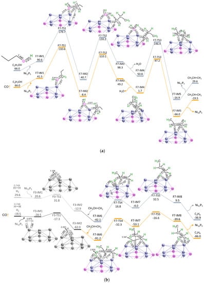 The potential energy curves with the relative Gibbs free energy (Gr, kJ mol−1) and the geometric structures with bond lengths (Å) reaction stages S10a (a) and S10b (b) over Ni12P5 cluster at GGA−PBE/DSPP, DNP level. For brevity, some hydrogen atoms are hidden.