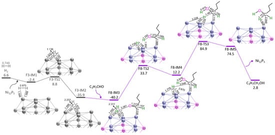 The potential energy curves with the relative Gibbs free energy (Gr, kJ mol−1) and the geometric structures with bond lengths (Å) for reaction stage S8 over Ni12P5 cluster at GGA−PBE/DSPP, DNP level. For brevity, some hydrogen atoms are hidden.