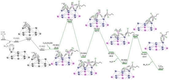 The potential energy curves with the relative Gibbs free energy (Gr, kJ mol−1) and the geometric structures with bond lengths (Å) reaction stage S9 over Ni12P5 cluster at GGA−PBE/DSPP, DNP level. For brevity, some hydrogen atoms are hidden.