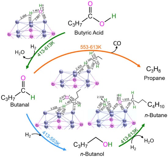 - Fu, S.; Wang, Z.M.; Liu, L.J.; Liu, T.H.; Li, D.; Yang, H.Q.; Hu, C.W. Theoretical insight into the deoxygenation molecular mechanism of butyric acid catalyzed by a Ni12P6 cluster. Catal. Sci. Technol. 2021, 11, 6425–6437. [Google Scholar] [CrossRef]