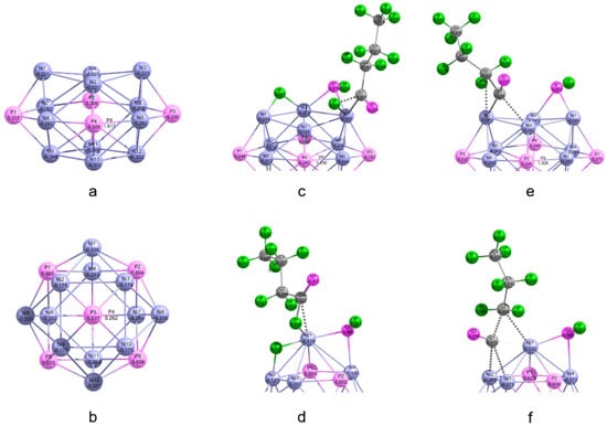 Mulliken charges for (a) Ni12P5 cluster, (b) Ni12P6 cluster, (c) F3-TS3 over Ni12P5 cluster, (d) 3-TS3 over Ni12P6 cluster, (e) F5-TS2 over Ni12P5 cluster, and (f) 5-TS2 over Ni12P6 cluster, respectively.