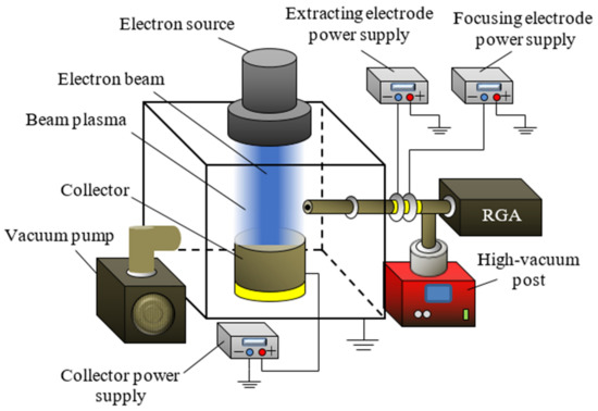 The experimental setup is shown in Figure 4. The beam plasma was generated using a forevacuum hollow-cathode plasma electron source, operating in a continuous mode. A detailed description and the working principle are discussed in [15]. At an accelerating voltage of 10 kV, the electron beam current was maintained at a level of 50 mA. The plasma ion composition was measured with an RGA-300 residual atmosphere quadrupole mass spectrometer (Residual Gas Analyzer, Stanford Research Systems, Sunnyvale, CA, USA). When conducting the experiments, we replaced the analyzer ionizer with a two-electrode ion-optical system to extract ions from the beam plasma (Figure 5). As opposed to the previous design of the mass spectrometer [16], the electrodes were made of stainless steel with a higher temperature resistance. The extraction plate and the drift tube were combined into one extracting electrode. This solution enabled us to reduce the number of insulators and sealings between the electrodes in the ion extraction region where the temperature was maximal.