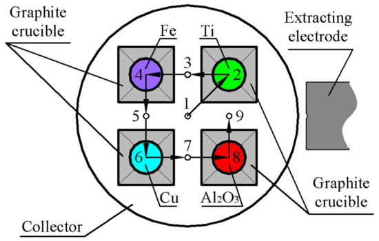 To this end, graphite crucibles were mounted on the electron beam collector of the experimental installation with one pumping stage. Fragments of various metals (titanium, iron, copper) and alumina ceramics were put inside the crucibles. Numbers in Figure 6 show the positions of the electron beam at different moments of time.