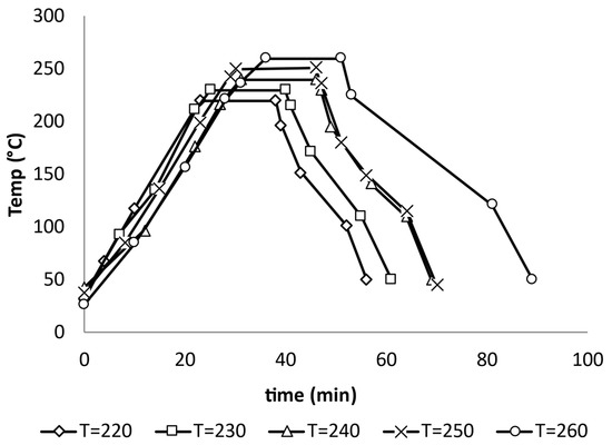 The thermal pathways from 220–260 °C (58 to 80 bar) are shown in Figure 1. The heating rate (~7 °C/min) exceeded the minimum 2 °C/min required for maximum sugar yields [13,42].