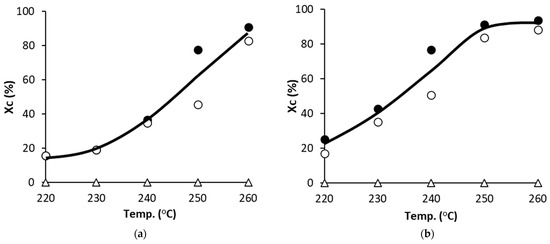The conversion of cellulose (Xc, %) into products under N2 and CO2 is shown in Figure 2a,b, respectively, increasing exponentially with respect to temperature.