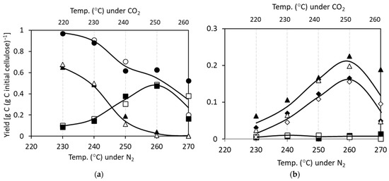 Substituting CO2 for N2 increased Xc, e.g., at 250 °C the conversion was 59.2 ± 12.8% and 73.3 ± 8.1% under N2 and CO2, respectively (mean ± SEM; 3 experiments). The use of CO2 shifted down the products and TOC profiles by 10 °C and were comparable (Figure 3) with respect to the production of glucose, fructose or 5-HMF, which was approximately equimolar with glucose. The low fructose (Figure 3b) is consistent with it being the precursor of 5-HMF. Some decomposition of products occurred above 260 °C under N2 and 250 °C under CO2 (Figure 3).