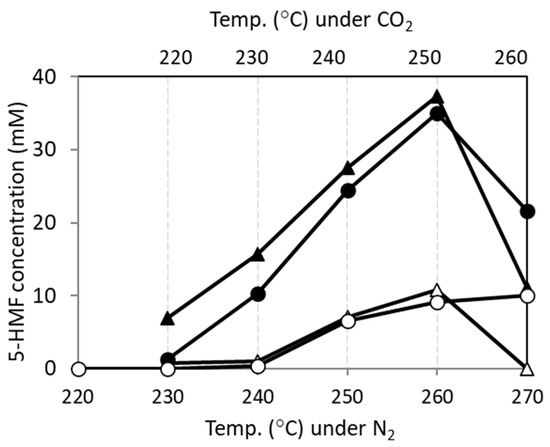 Concentrations (mM) of 5-HMF before (filled symbols) and after (open symbols) AC treatment for experiments prepared under CO2 (▲,△) and N2 (●,○) at different reaction temperatures. Results shown are average values of two experiments with variation within ±5%.