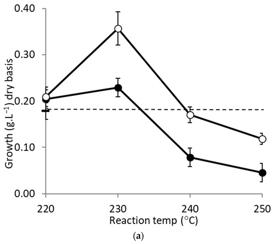 AC-treated hydrolysates supported twice the growth of E. coli in comparison with the control with hydrolysates prepared at 240 °C and 250 °C (Figure 5a).