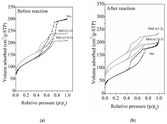 Nitrogen adsorption–desorption isotherms of the catalysts before (a) and after (b) the VOC combustion.