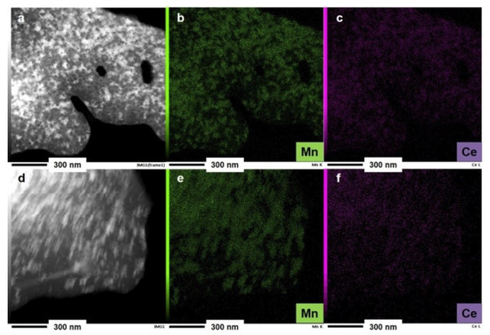 The EDX elemental mappings indicate clearly that black particles (in white on the TEM images of Figure 4a,d taken in dark field mode) contain Mn and Ce elements (Figure 4b,c,e,f).