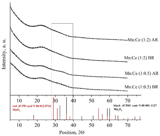 The XRD patterns, recorded using the MnCe (1:0.5) and MnCe (1:2) samples before and after the reaction, are similar and they do not show any crystalline phases of either magnesium oxides or cerium oxide, which indicates fine dispersion of the oxides present on the surface. However, some two-component broad signals from 15 to 37° 2θ are observed in the case of the first component, commonly attributed to amorphous silica. It is noteworthy that the baseline from 37 to 70° 2θ is not flat and one low intensity and broad wave is also distinguishable at 41°–49° 2θ, which has a broad signal at 27°–37° 2θ corresponding to the regions of the major diffraction peaks of the Mn3O4 crystalline phase (Figure 6). They probably indicate the starting crystallization of Mn3O4. In view of the fact that HRTEM indicates the formation of MnO2, it is very likely that both Mn3O4 and MnO2 are present on the surface. Based on a previous study of the Mn:Co-SBA-15 catalyst sample, which reported the crystallization of a solid solution CoxMn3-xO4 by insertion of Co into the Mn3O4 phase [21], it could be assumed that the Mn-Ce solid started to form. The lack of the XRD patterns for manganese oxides and CeO2 could be taken as evidence for the formation of finely divided MnOx and CeO2. The formation of a solid solution between MnOx and CeO2 of where the replacement of Ce4+ (0.97Å) by Mnx+ (Mn4+ = 0.53Å; Mn3+ = 0.65Å; Mn2+ = 0.83Å) structure similarity of both CeO2 and MnOx [13]. Qi and Yang [22] established that the mean crystallite size of ceria decreases with increasing Mn content, indicating that Mn atoms incorporated into CeO2 inhibit the crystal growth of ceria. The XRD data of the monocomponent Mn-SBA-15 sample were presented in our previous paper [18] where it was shown that both MnO2 Pyrolusite (card N° 01-071-4824) and Mn2O3 Bixbyite (Card N° 00-041-1442) phases coexist on the surface.