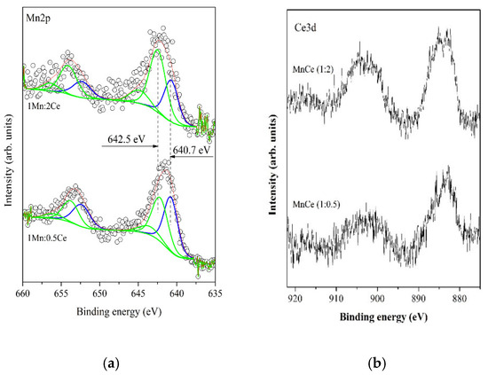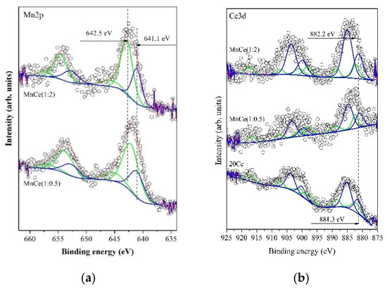 The oxidation states of Mn and Ce on the surface are examined by XPS. Figure 7 shows an example curve fitting of Mn2p (left-hand side) and Ce3d (right-hand side) core levels of investigated samples before the catalytic activity test.