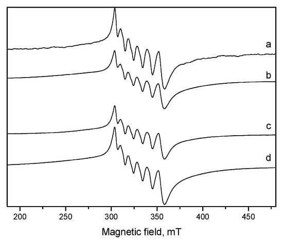 The powdered EPR spectra of all samples, measured at low temperatures, are shown in Figure 9.