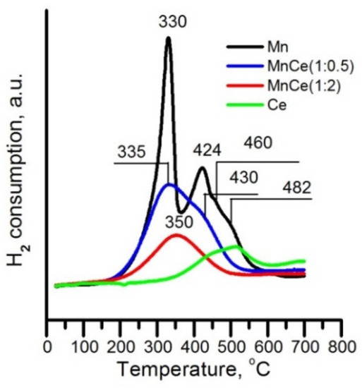 The heating temperature was limited to 700 °C, close to the temperature range used for the catalytic activity tests. The TPR profile of the manganese sample exhibits peaks at 330 °C and 424 °C and shoulders at 460 °C and 483 °C. Taking into account that according to XRD data MnO2 and Mn2O3 are formed on the surface, we can attribute the hydrogen consumption at 330 °C and 424 °C to the reduction of MnO2 and the other two to the reduction of Mn2O3 [29,30]. Table 4 represents the peak areas for Mn-SBA-15 and MnCe (1:0.5) catalysts.