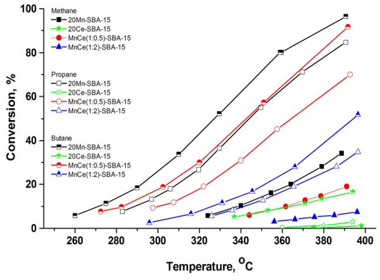 The obtained results from the catalytic activity tests for complete oxidation of methane, propane and butane under testing conditions and reached stationary activities are shown in Figure 11. For comparison, the data for the mono-component Ce-SBA-15 sample are given.